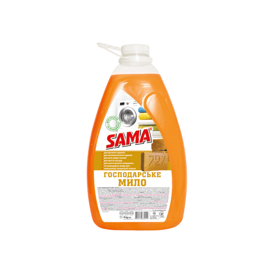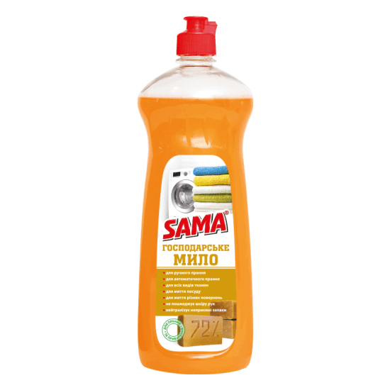 SAMA TM Liquid household soap is a natural product made from natural ingredients, similar in its properties to the bar soap we have known since childhood. It washes well in hot and cold water, forms a stable lather, is economical to use, and cleans dirty items perfectly. Suitable for all types of washing: hand washing and machine washing. It is a universal cleaning product for the home: it can be used to clean floors, kitchens, dishes and bathroom fixtures. Effectively removes dirt from any surface.