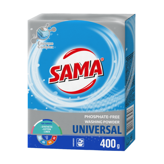 SAMA TM phosphate-free washing powder for hand washing is designed for hand washing at temperatures between 30°C and 40°C. Not suitable for washing wool or silk.