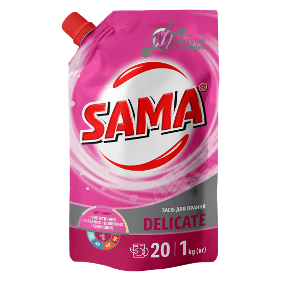 SAMA-Delicate is a universal synthetic laundry detergent designed to remove stains when washing knitted items, wool items, natural and artificial silk items, and delicate synthetic fabrics. Gently and effectively cleans, protects the fabric from deformation, pilling and discolouration.